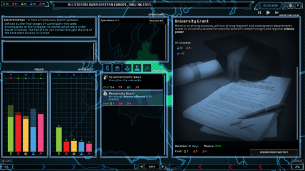 Players will direct covert operations to increase their control over countries’ economies, political parties, militaries, science institutions and media outlets. Operations will entail everything from low key kickbacks to military leaders to the brazen assassination of political rivals.